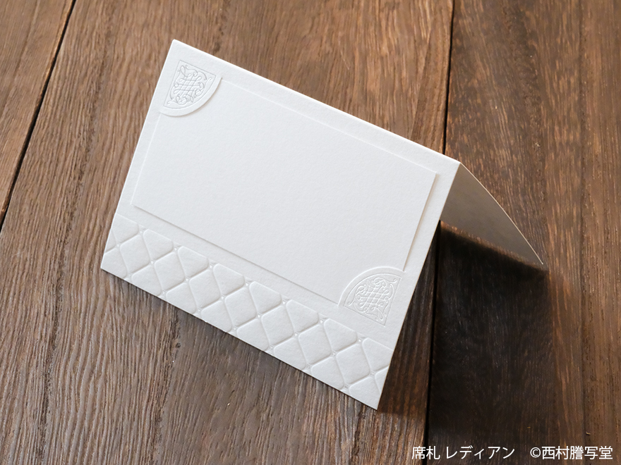 純白の台紙に、銀箔と浮き出し加工を施しています。